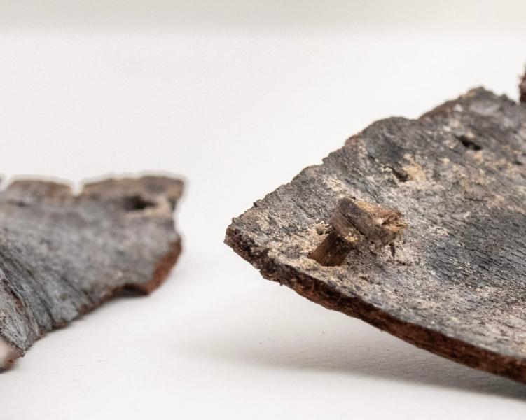 Respecto al material cultural asociado a esta colección, si bien es mucho menor, no es menos interesante. Destaca el hallazgo de fragmentos de cortezas trabajadas, que presentan formas redondeadas en sus extremos. Pero lo más extraordinario, es que se presentan perforaciones que se tratarían de “ojales”, pues en algunas se conservan restos de nudos realizados con tendón de animal. Si bien la función que cumplió este objeto es desconocida, la investigación de este material nos señala que se encuentra asociado a un contexto funerario pues fue recuperado de un alero utilizado exclusivamente con esos fines y que afortunadamente, no fue alterado por actividades humanas posteriores.
