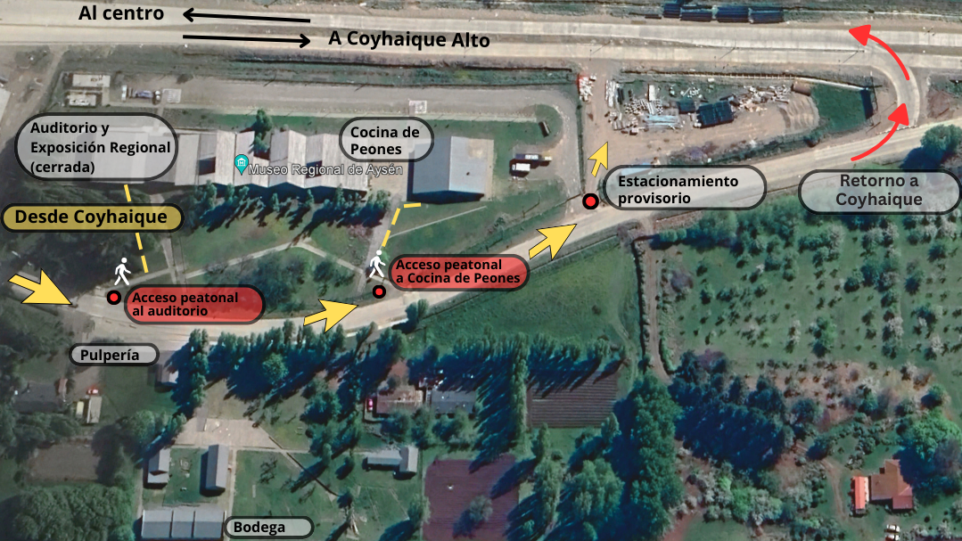- El acceso al auditorio, se realiza por camino peatonal provisorio. Su ingreso está frente a Pulpería.