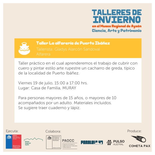 Entre los días martes 9 y viernes 19 de julio, se desarrollarán una serie de talleres organizados por el Museo Regional de Aysén, para personas desde los 5 años en adelante. Esta actividad forma parte de la oferta de invierno y busca acercar el arte, ciencia y patrimonio a la comunidad regional.